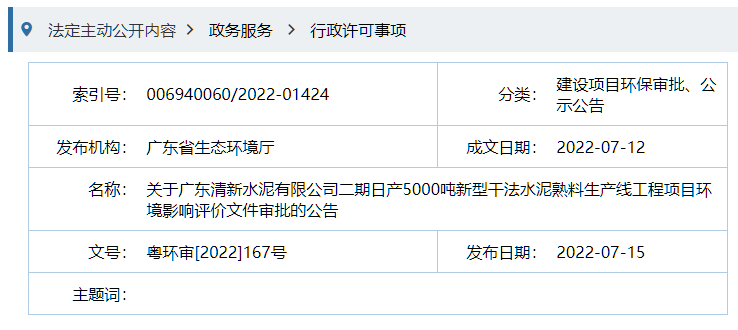 日前,廣東生態(tài)環(huán)境廳發(fā)布《關(guān)于廣東清新水泥有限公司二期日產(chǎn)5000噸新型干法水泥熟料生產(chǎn)線工程項(xiàng)目環(huán)境影響評價(jià)文件審批的公告》提到廣東清新水泥有限公司報(bào)批的《廣東清新水泥有限公司二期日產(chǎn) 5000 噸新型干法水泥熟料生產(chǎn)線工程項(xiàng)目環(huán)境影響報(bào)告書》(以下簡稱報(bào)告書)等材料收悉。