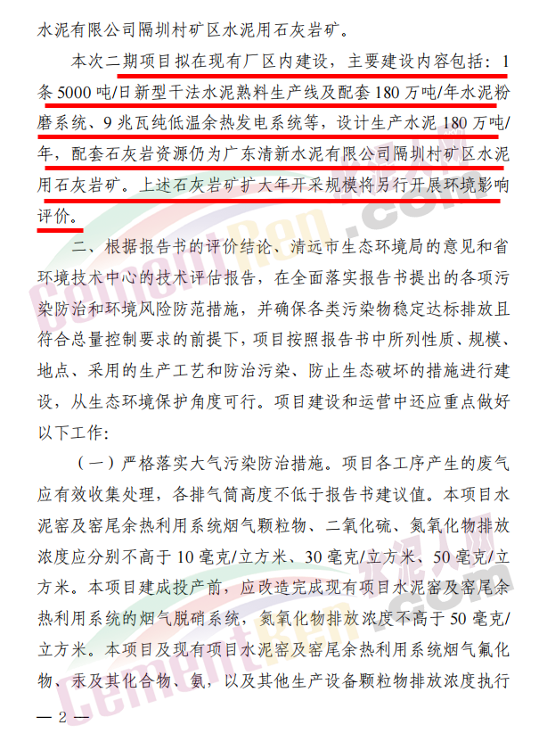 本次二期項(xiàng)目擬在現(xiàn)有廠區(qū)內(nèi)建設(shè),主要建設(shè)內(nèi)容包括:1條 5000 噸/日新型干法水泥熟料生產(chǎn)線及配套 180 萬噸/年水泥粉磨系統(tǒng)、9 兆瓦純低溫余熱發(fā)電系統(tǒng)等,設(shè)計(jì)生產(chǎn)水泥 180 萬噸/年,配套石灰?guī)r資源仍為廣東清新水泥有限公司隔圳村礦區(qū)水泥用石灰?guī)r礦。上述石灰?guī)r礦擴(kuò)大年開采規(guī)模將另行開展環(huán)境影響評價(jià)。