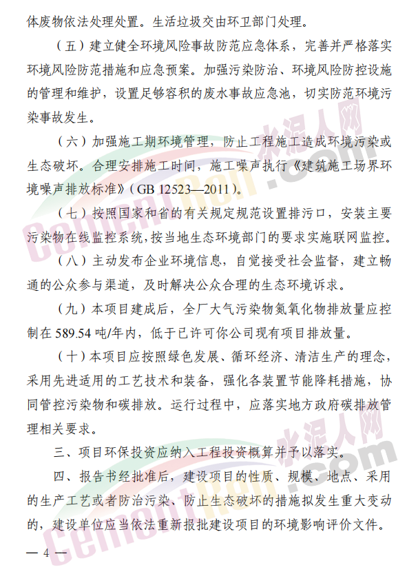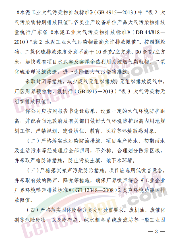 (一)嚴(yán)格落實(shí)大氣污染防治措施。項(xiàng)目各工序產(chǎn)生的廢氣應(yīng)有效收集處理,各排氣筒高度不低于報(bào)告書建議值。本項(xiàng)目水泥窯及窯尾余熱利用系統(tǒng)煙氣顆粒物、二氧化硫、氮氧化物排放濃度應(yīng)分別不高于 10 毫克/立方米、30 毫克/立方米、50 毫克/立方米。