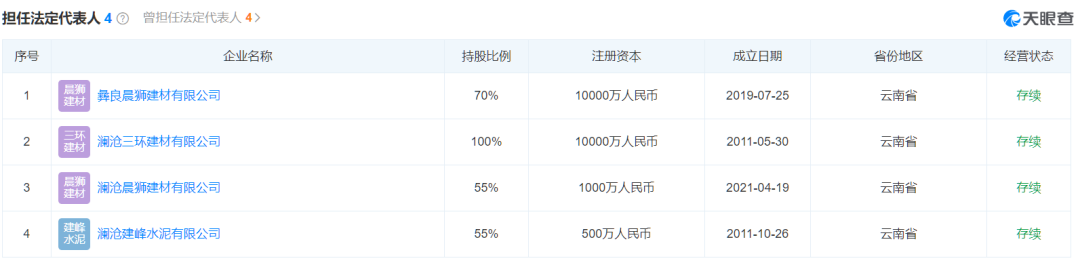 企業(yè)法人楊志明,除擔(dān)任彝良晨獅建材有限公司法人外,還擔(dān)任瀾滄建峰水泥有限公司、瀾滄晨獅建材有限公司、瀾滄三環(huán)建材有限公司三家企業(yè)法人。