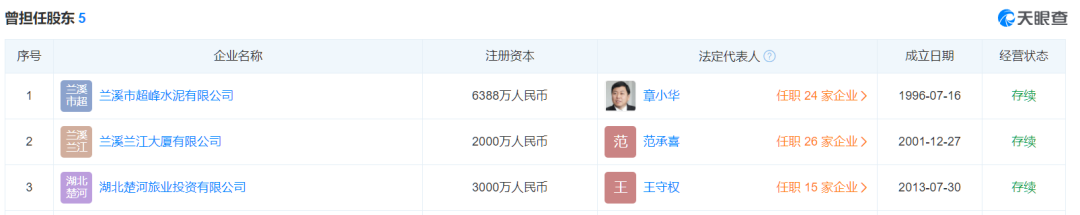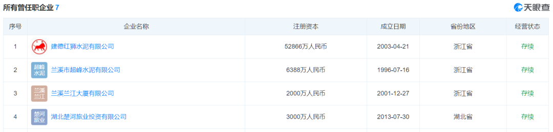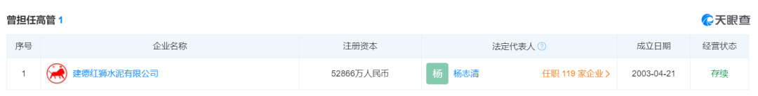 天眼查顯示,楊志明還曾擔(dān)任浙江紅獅水泥股份有限公司、紅獅控股集團(tuán)有限公司、西烏珠穆沁旗哈達(dá)圖水泥有限責(zé)任公司等多家企業(yè)股東。