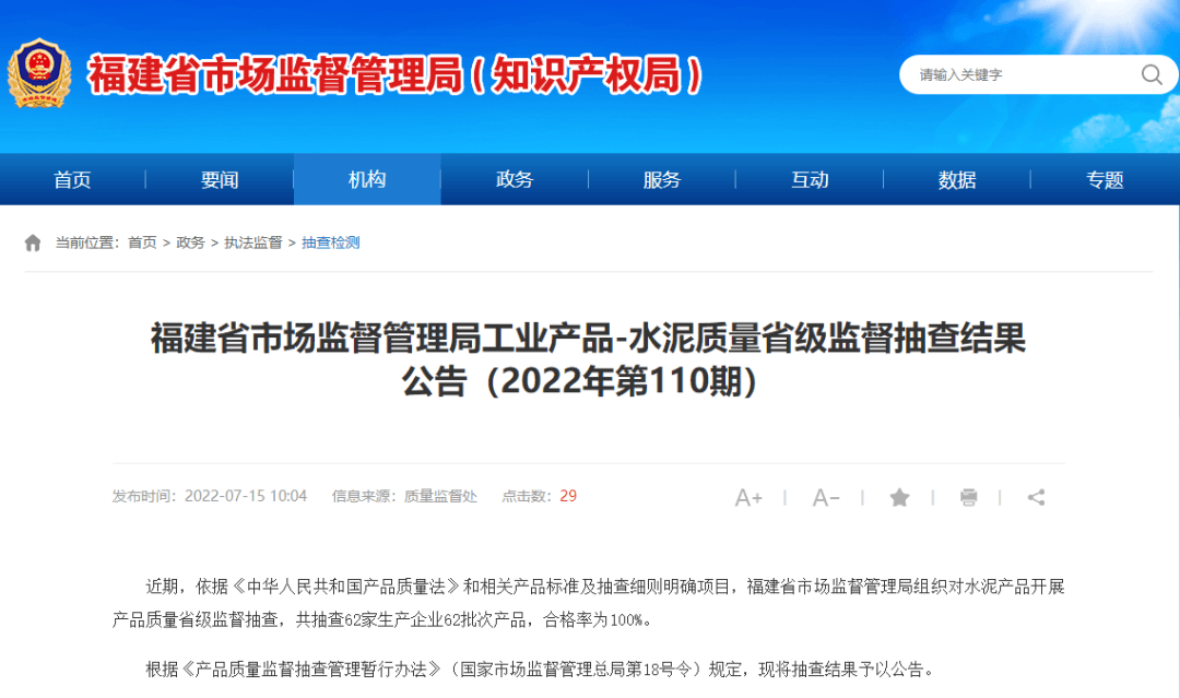 7月15日,福建省市場(chǎng)監(jiān)督管理局公布了《福建省市場(chǎng)監(jiān)督管理局工業(yè)產(chǎn)品-水泥質(zhì)量省級(jí)監(jiān)督抽查結(jié)果公告(2022年第110期)》。