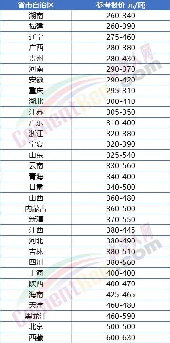 部分區(qū)域P.O42.5散裝水泥參考報(bào)價(jià)