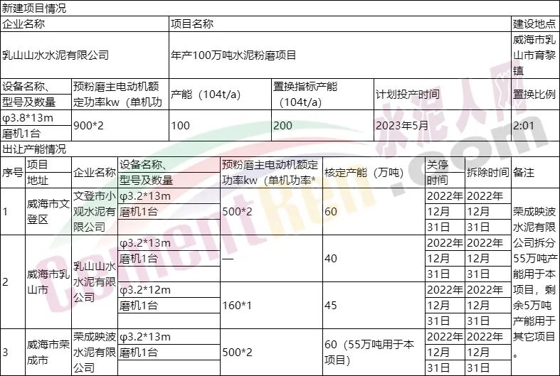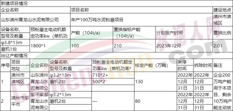 年產(chǎn)100萬噸水泥粉磨項目產(chǎn)能置換情況