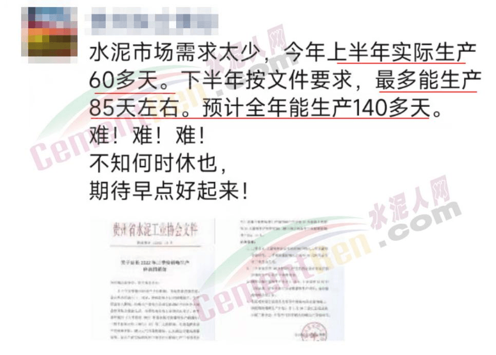 貴州某企業(yè)負(fù)責(zé)人反饋稱,今年水泥市場需求太少,上半年實(shí)際生產(chǎn)60多天。按文件要求,下半年最多能生產(chǎn)85天左右,預(yù)計(jì)全年能生產(chǎn)140多天。