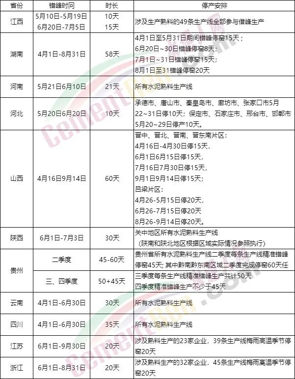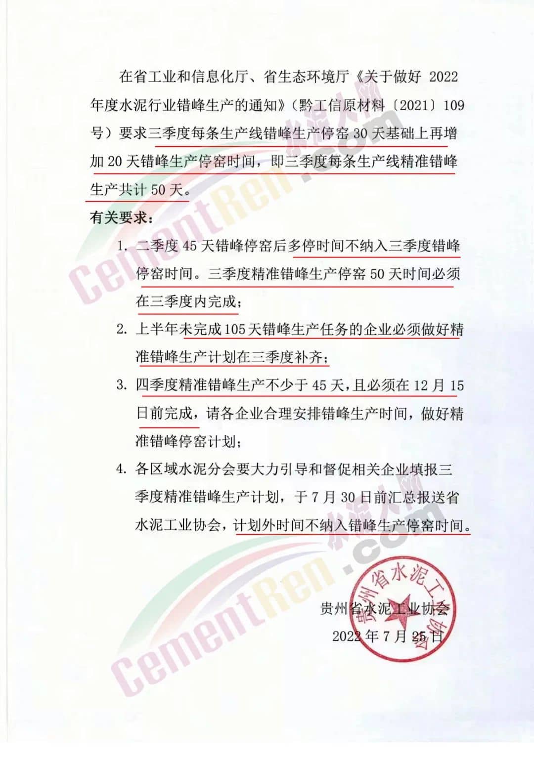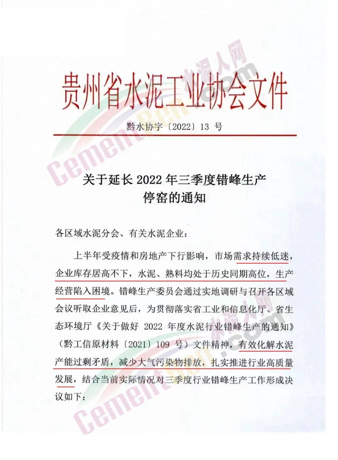 日前,貴州省水泥工業(yè)協(xié)會(huì)發(fā)布《關(guān)于延長2022年三季度錯(cuò)峰生產(chǎn)停窯的通知》要求三季度在每條生產(chǎn)線錯(cuò)峰生產(chǎn)停窯30天基礎(chǔ)上再增加20天錯(cuò)峰生產(chǎn)停窯時(shí)間,即三季度每條生產(chǎn)線精準(zhǔn)錯(cuò)峰生產(chǎn)共計(jì)50天。