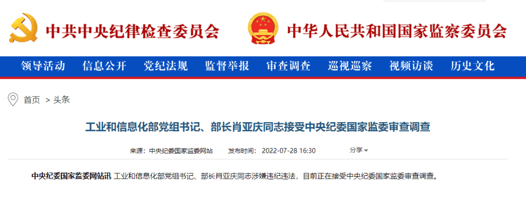 7月28日,中央紀委國家監(jiān)委網(wǎng)站訊 工業(yè)和信息化部黨組書記、部長肖亞慶同志涉嫌違紀違法,目前正在接受中央紀委國家監(jiān)委審查調(diào)查。