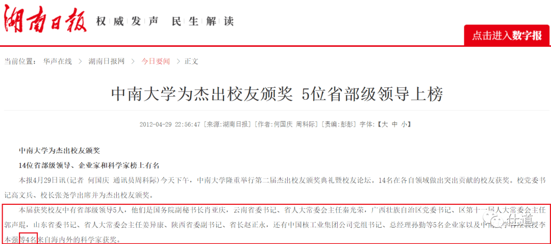 這屆中南大學(xué)的杰出校友評了14個,當(dāng)時對此做報道的《湖南日報》特別指出,“本屆獲獎校友中有省部級領(lǐng)導(dǎo)5人”。