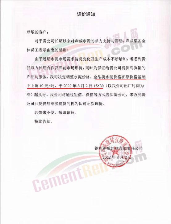 同日,銅川聲威建材有限責(zé)任公司通知自8月2日起上調(diào)全品類水泥價(jià)格40元/噸。