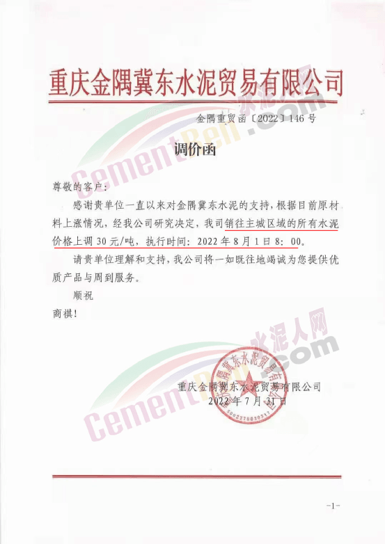 重慶金隅冀東水泥貿(mào)易有限公司通知,根據(jù)目前原材料上漲情況,經(jīng)公司研究決定,自8月1日8時(shí)起,銷往重慶主城區(qū)的所有水泥價(jià)格上調(diào)30元/噸。