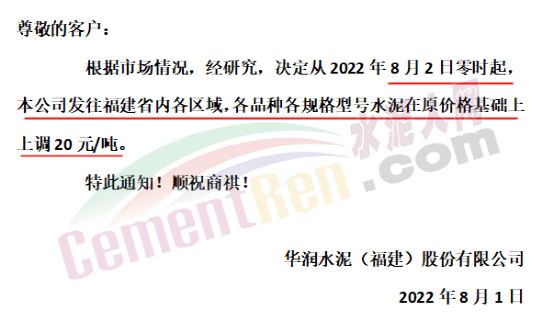 華潤水泥(福建)股份有限公司通知,從2022年8月2日零時(shí)起,上調(diào)水泥價(jià)格20元/噸。