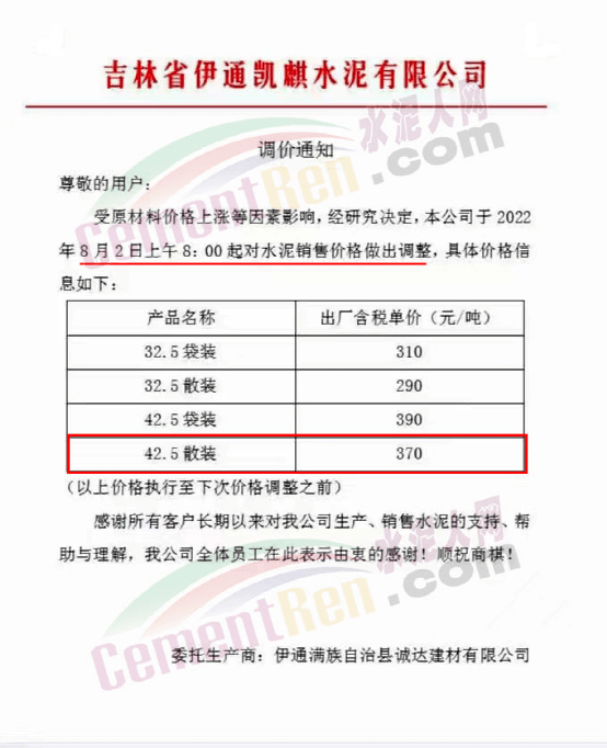 吉林省伊通凱麒水泥有限公司通知,受原材料價(jià)格上漲等因素影響,經(jīng)研究決定,公司于8月2日上午8時(shí)起對水泥銷售價(jià)格做出調(diào)整,調(diào)整后42.5散裝水泥出廠含稅報(bào)價(jià)370元/噸。
