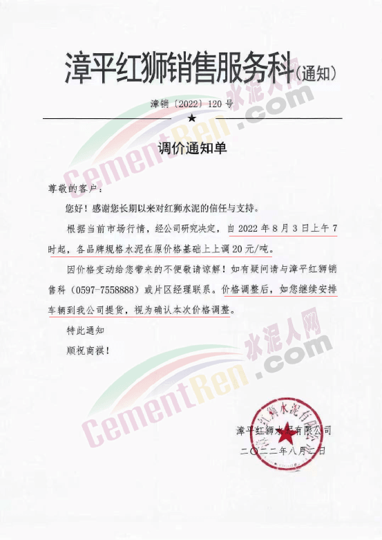 漳平紅獅銷售服務(wù)科調(diào)價通知稱,根據(jù)當(dāng)前市場行情 ,經(jīng)公司研究決定,自8月3日上午7時起,各品牌規(guī)格水泥在原價基礎(chǔ)上上調(diào)20元/噸。價格調(diào)整后,如繼續(xù)安排車輛內(nèi)到公司提貨,視為確認本次價格調(diào)整。