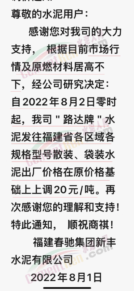 福建春馳集團新豐水泥有限公司通知根據(jù)目前市場行情及原燃材料居高不下,經(jīng)公司研究決定自8月2日零時起,公司“路達”牌水泥發(fā)往福建省各區(qū)域各規(guī)格型號散裝、袋裝水泥出廠價格在原價基礎(chǔ)上上調(diào)20元/噸。