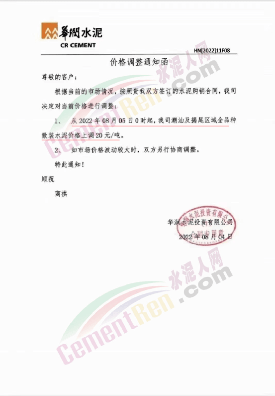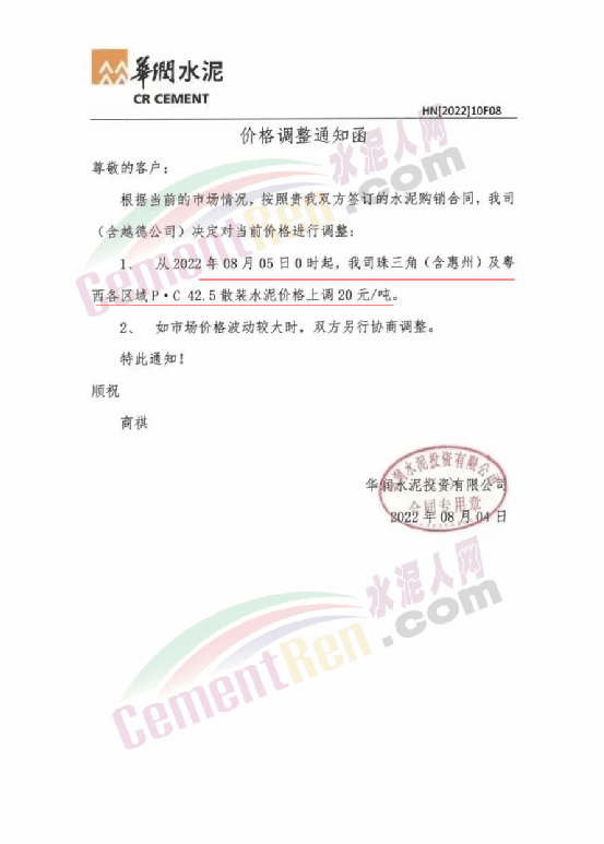 水泥人網(wǎng)通訊員消息,日前,華潤水泥投資有限公司通知,從8月4日0時起,公司廣東及海南地區(qū)熟料銷售價格上調20元/噸。潮汕及揭尾區(qū)域全品種散裝水泥,珠三角(含惠州)及粵西各區(qū)域P.C42.5散裝水泥價格同步上調20元/噸。
