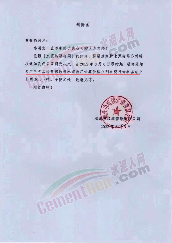同期梅州市塔牌營有限公司通知,自8月6日零時起,福梅基地各廠所有品種等級散裝水泥出廠結算價格分別在現(xiàn)行價格基礎上上調20元/噸。