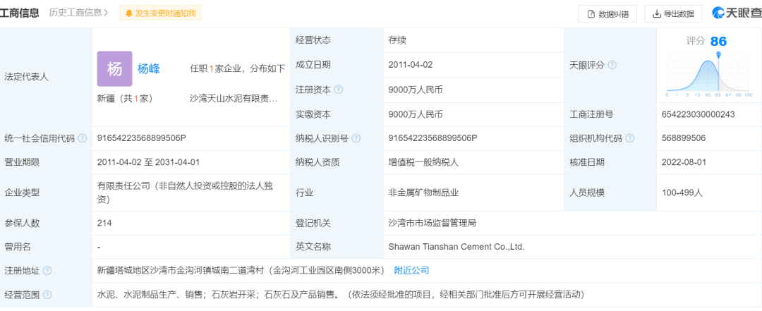 天眼查App顯示,2022年8月1日沙灣天山水泥有限責(zé)任公司發(fā)生工商變更,法定代表人由徐克瑞變更為楊峰。