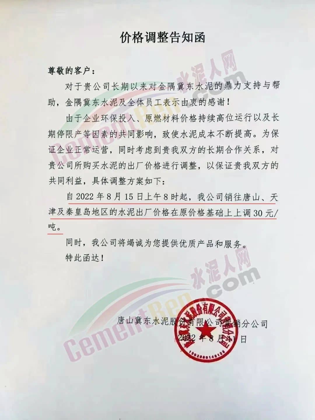唐山冀東水泥通知,由于企業(yè)環(huán)保投入,原材料價(jià)格持續(xù)高位運(yùn)行以及長期停限產(chǎn)等因素的共同影響,致使水泥成本不斷提高。自8月15日上午8時(shí)起,公司銷往唐山、天津及秦皇島地區(qū)的水泥出廠價(jià)格在原價(jià)基礎(chǔ)上上調(diào)30元/噸。