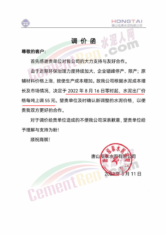 唐山泓泰水泥有限公司通知,由于近期環(huán)保治理力度持續(xù)加大,企業(yè)錯(cuò)峰停產(chǎn)、限產(chǎn);原輔材料價(jià)格上漲,致使生產(chǎn)成本增加。公司根據(jù)水泥成本增長及市場情況,決定于8月16日零時(shí)起,水泥出廠價(jià)格上調(diào)55元/噸。