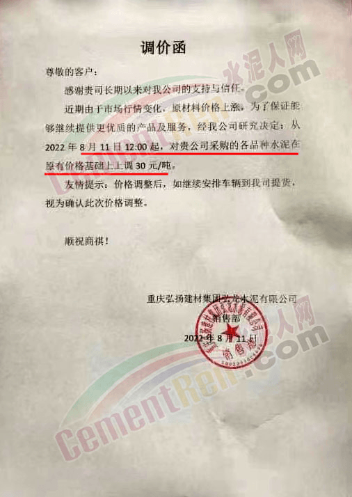 渝東營銷中心秀山營銷處通知,根據(jù)當(dāng)前周邊市場形勢,近期原燃材料持續(xù)上漲,導(dǎo)致生產(chǎn)成本不斷增加,為保證能夠繼續(xù)提供更優(yōu)質(zhì)的產(chǎn)品及服務(wù),經(jīng)公司研究決定對所有區(qū)域各品種水泥出廠價(jià)格上調(diào)30元/噸,執(zhí)行日期為2022年8月11日8時(shí)。