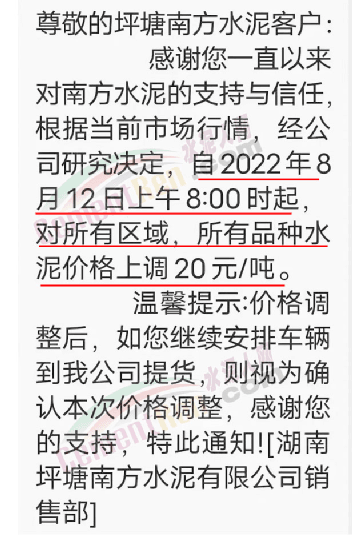 坪塘南方水泥通知,根據(jù)當前市場行情,經(jīng)公司研究決定,自2022年8 月12日上午8∶00時起,對所有區(qū)域,所有品種水泥價格上調(diào)20元/噸。