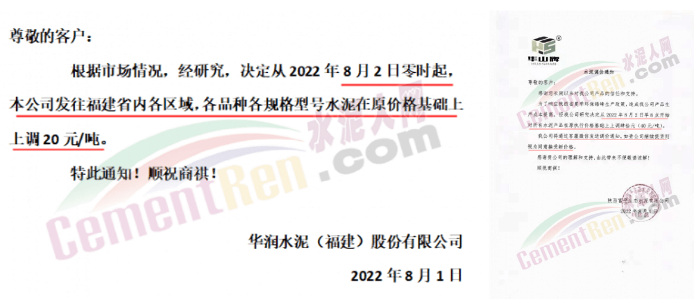 近來多區(qū)域通知上調(diào)水泥價格。日前,桃江南方水泥通知,根據(jù)當前市場行情,經(jīng)公司研究決定自2022年8月12日08時起,對長沙市(含寧鄉(xiāng)),湘陰縣所有品種包、散裝水泥價格上調(diào)20元/噸。價格調(diào)整后,如繼續(xù)安排車輛到公司提貨,則視為確認本次調(diào)整。