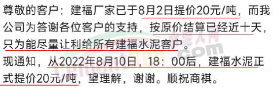 建福水泥廠下屬企業(yè)日前發(fā)通知給客戶稱,廠家已于8月初提價,而公司為了答謝客戶的支持,盡量讓利給所有建福水泥客戶,已經(jīng)延遲十天提價。