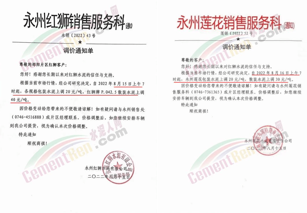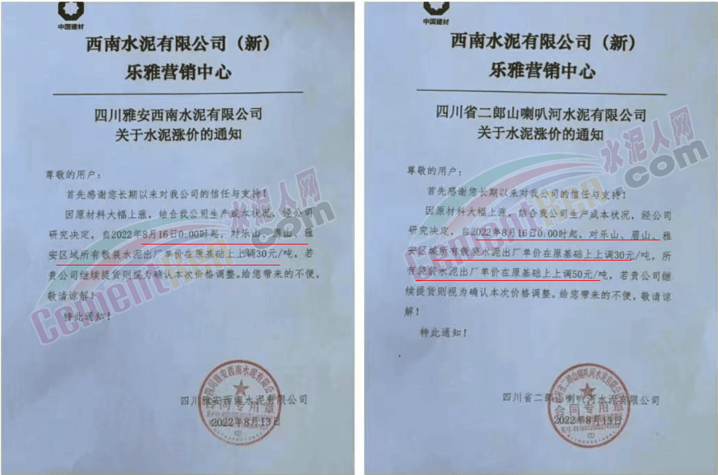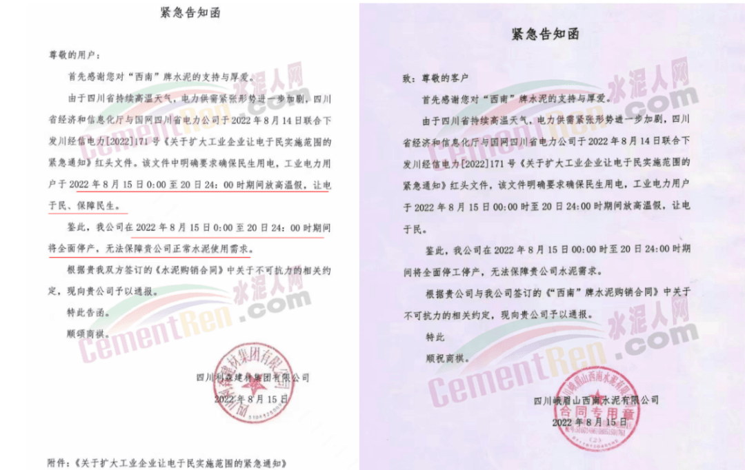 四川區(qū)域西南水泥旗下兩家企業(yè)發(fā)《緊急告知函》稱,由于四川省持續(xù)高溫天氣,電力供需緊張形勢(shì)進(jìn)一步加劇,四川省經(jīng)濟(jì)和信息化廳與國(guó)網(wǎng)四川省電力公司聯(lián)合下發(fā)紅頭文件。要求確保民生用電,工業(yè)電力用戶于2022年8月15日0:00至20日24:00時(shí)期間放高溫假,讓電于民、保障民生。鑒于此,公司將全面停產(chǎn),且無法保障客戶正常水泥使用需求。