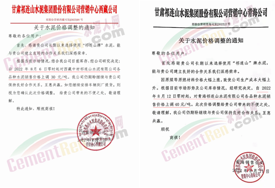 甘肅祁連山水泥青海區(qū)域上調(diào)40元/噸,西藏區(qū)域上調(diào)30元/噸。
