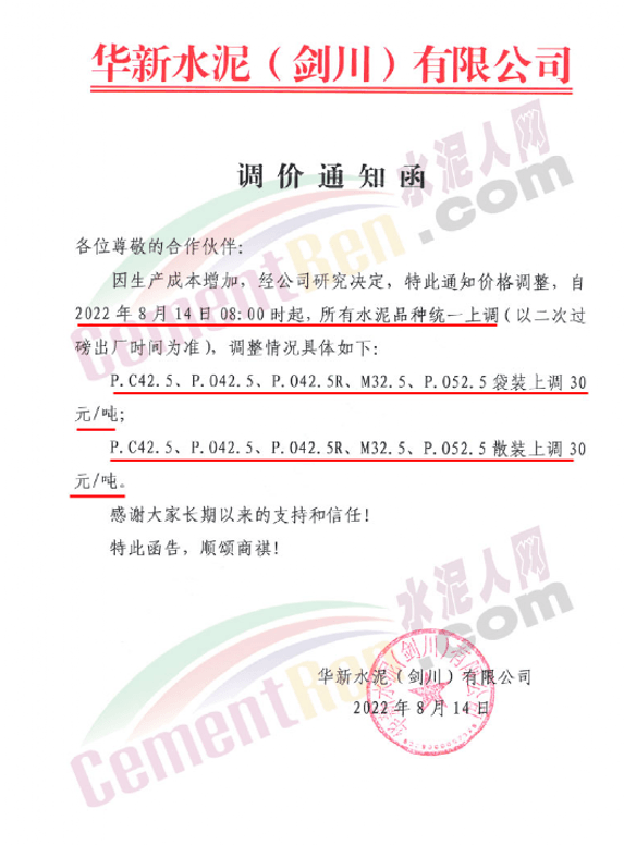 云南華新劍川工廠水泥價(jià)格上調(diào)30元/噸