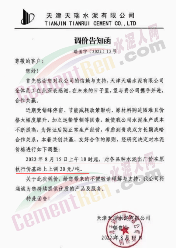 天津天瑞上調(diào)水泥價(jià)格30元/噸。