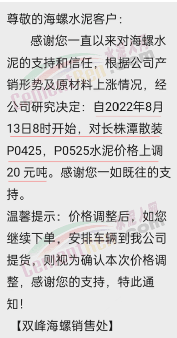 據(jù)水泥人網(wǎng)了解,海螺水泥在多區(qū)域都與當(dāng)?shù)仄髽I(yè)同步上調(diào)了水泥價(jià)格,且多數(shù)通過電話,短信等方式通知下游客戶。其中雙峰海螺通知長(zhǎng)株潭散裝水泥價(jià)格上調(diào)20元/噸。