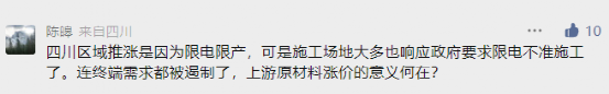 來自四川的網(wǎng)友提出疑問,四川區(qū)域推漲是因?yàn)橄揠娤蕻a(chǎn),可是施工場(chǎng)地大多也響應(yīng)政府要求限電不準(zhǔn)施工了。連終端需求都被遏制了,上游原材料漲價(jià)的意義何在?
