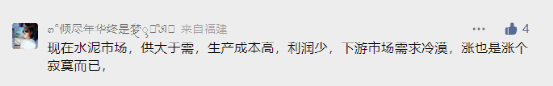 福建網(wǎng)友表示,現(xiàn)在水泥市場(chǎng),供大于需,生產(chǎn)成本高,利潤(rùn)少,下游市場(chǎng)需求冷漠,漲也是漲個(gè)寂寞而已。