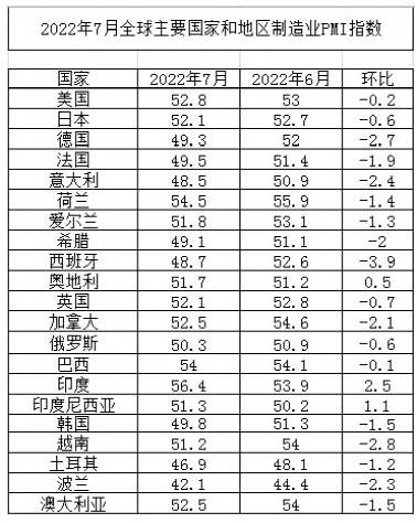 海外多個(gè)經(jīng)濟(jì)發(fā)達(dá)體面臨增長(zhǎng)動(dòng)能放緩的風(fēng)險(xiǎn),經(jīng)濟(jì)瀕臨回落,市場(chǎng)風(fēng)險(xiǎn)加大,對(duì)于原材料及部分產(chǎn)品的采購(gòu)環(huán)節(jié)必然會(huì)受到影響。這種消費(fèi)降價(jià)無(wú)疑也影響到了全球制造業(yè)發(fā)展的進(jìn)程。數(shù)據(jù)顯示,7月全球制造業(yè)PMI指數(shù)為51.1,較上月下降了1.1個(gè)百分點(diǎn)。多數(shù)國(guó)家讀數(shù)連續(xù)多月下降,經(jīng)濟(jì)衰退風(fēng)險(xiǎn)已經(jīng)近在眼前。