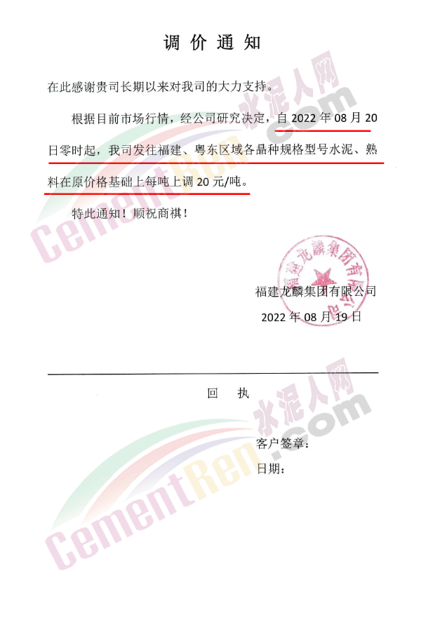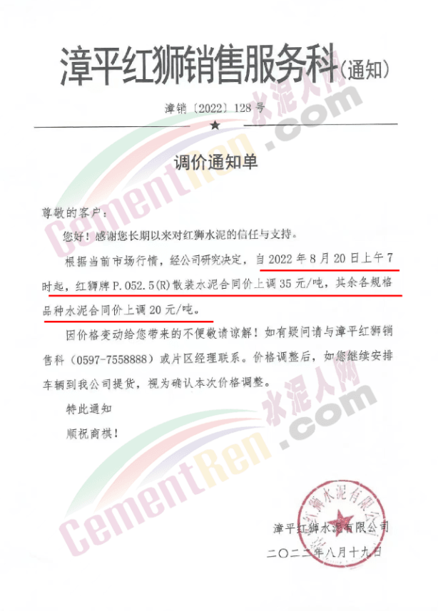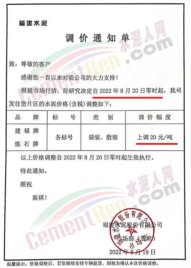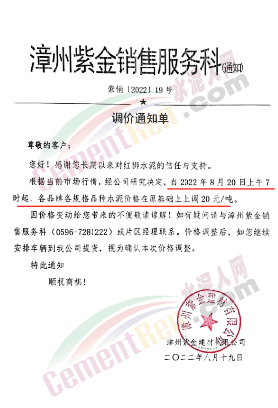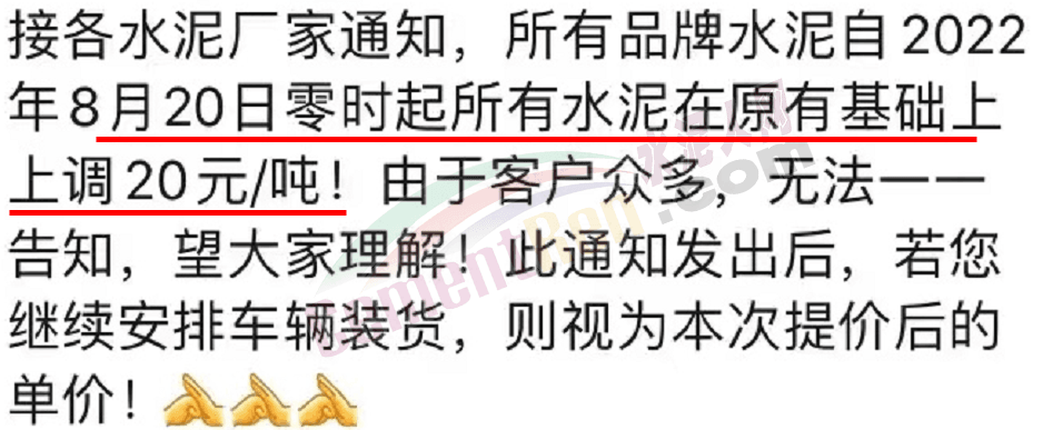 重要通知,8月19日起水泥漲價,32.5、42.5水泥全品種集體上漲。