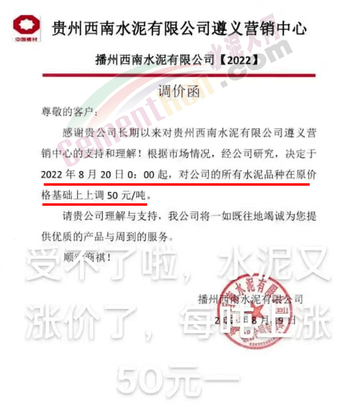 貴州西南水泥遵義營銷中心通知,8月20日0時起所有水泥品牌上調50元/噸。