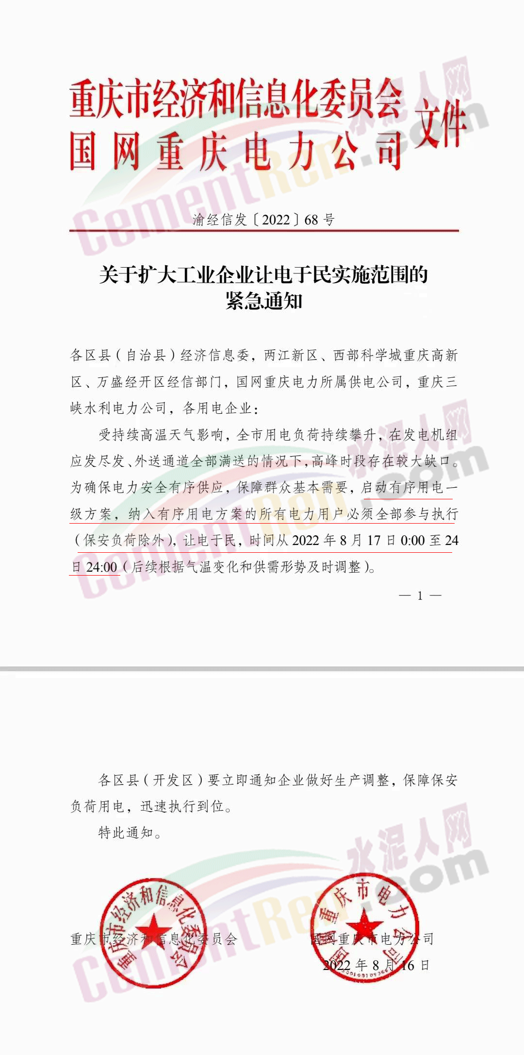 16日重慶發(fā)文從8月17日00點(diǎn)至24日24點(diǎn)啟動有序用電一級方案。