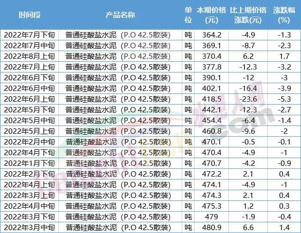 煤價漲幅近50%,而水泥價格漲幅卻未達到同步。流通領(lǐng)域P.O42.5散裝水泥今年初至今均價為437.71元,上年同期為422.49元/噸,上漲了15.22元/噸,漲幅僅為3.6%。國家統(tǒng)計局數(shù)據(jù)顯示,年初至8月上旬,流通領(lǐng)域最低價出現(xiàn)在7月下旬,為364.2元/噸,最高價出現(xiàn)在3月中旬,為480.9元/噸,差價達116.7元/噸。