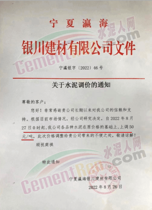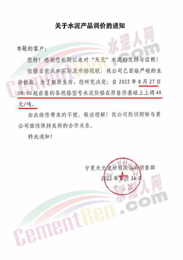 內(nèi)蒙古松塔水泥通知,8月27日8時(shí)起各品種水泥價(jià)格上調(diào)50元/噸。