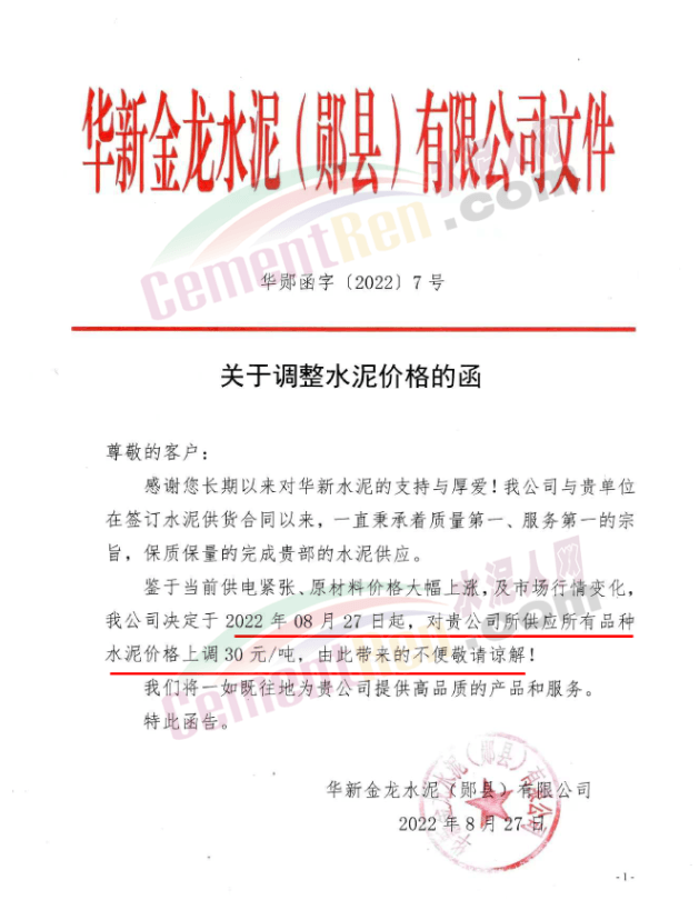 位于湖北省十堰市的華新金龍水泥(鄖縣)公司通知,鑒于當(dāng)前供電緊張、原材料價(jià)格大幅上漲,及市場行情變化,公司決定于2022年08月27日起,對所有品種水泥價(jià)格上調(diào)30元/噸。