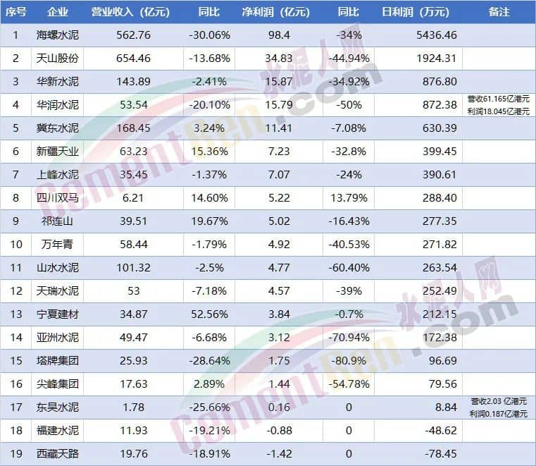 海螺水泥營收、利潤均下滑三成以上。凈利潤98.4億元,首次跌至100億元以下。仍處于19家上市企業(yè)凈利潤排名第一位,日利潤達(dá)5436.46萬元,遙遙領(lǐng)先于同行業(yè)其他企業(yè)。