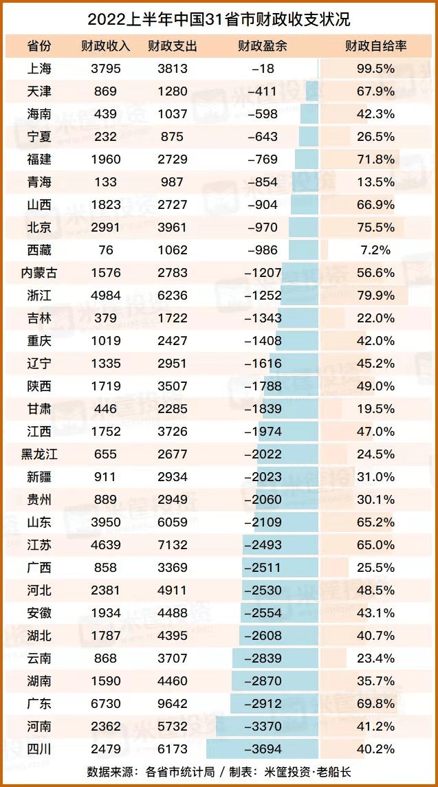 如果只看財(cái)政收入增速的話,上半年只有內(nèi)蒙古、山西、新疆、陜西、江西5個省份正增長,26個省市負(fù)增長。如果看財(cái)政盈余的話,31個省市無一為正。