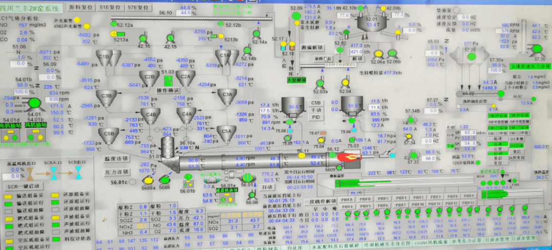 最近的一條標(biāo)準(zhǔn)設(shè)計的5000t/d生產(chǎn)線,在兩年前就全部打開三次風(fēng)管閥門運行的基礎(chǔ)上,采用了“節(jié)能型低氮燃燒器”,把噴煤管定位在中心線以上進行運行,再次取得了降低熱耗,提高產(chǎn)量,提高熟料強度,降低高溫風(fēng)機轉(zhuǎn)速和電流的明顯效果。并且在產(chǎn)量達到7000t/d的工況下,一級旋風(fēng)筒出口的壓力只有5000pa。創(chuàng)造了同類型同規(guī)格預(yù)熱器的最低壓力和最低的熱耗。該生產(chǎn)線的運行界面如下: