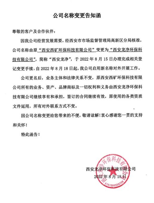 企業(yè)更名后,業(yè)務(wù)主體和法律關(guān)系不變,原西安西礦環(huán)保科技有限公司所有的業(yè)務(wù)、資產(chǎn)、品牌商標(biāo)及一切權(quán)利和義務(wù)由西安龍凈環(huán)??萍加邢薰纠^續(xù)享有和承擔(dān),簽訂的合同繼續(xù)有效,原使用的各類資質(zhì)文件延用,所有對外聯(lián)系方式不變。