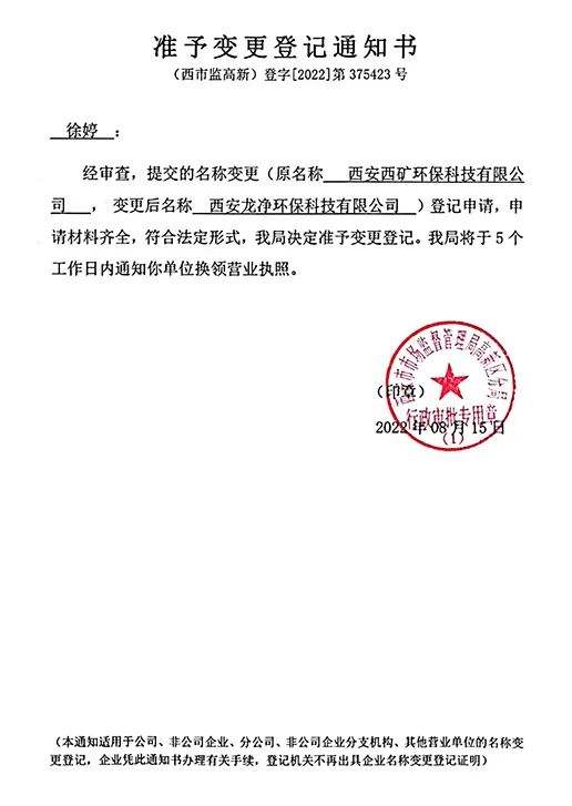 因企業(yè)經(jīng)營發(fā)展需要,經(jīng)西安市市場監(jiān)督管理局高新區(qū)分局核準(zhǔn),企業(yè)名稱由原“西安西礦環(huán)??萍加邢薰?rdquo;變更為“西安龍凈環(huán)??萍加邢薰?rdquo;,簡稱“西安龍凈”,于2022年8月15日辦理完成相關(guān)登記變更手續(xù),自2022年8月18日起,企業(yè)啟用新名稱對外開展工作。