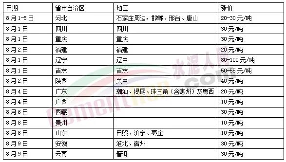 據(jù)水泥人網(wǎng)不完全統(tǒng)計(jì)7月中旬至8月初江蘇、浙江、上海、安徽、河南、山東、河北、福建、遼寧、吉林、陜西、重慶、四川、貴州、廣西等20多個區(qū)域水泥價(jià)格通知上調(diào)。進(jìn)入8月中旬,發(fā)布漲價(jià)函的區(qū)域進(jìn)一步擴(kuò)大至青海、寧夏、內(nèi)蒙、黑龍江、湖北、北京、天津等30多個區(qū)域。