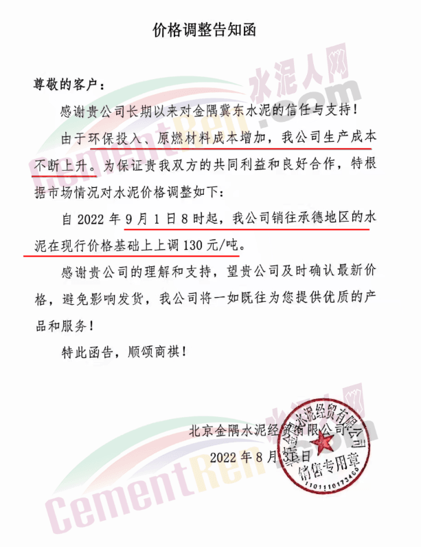 水泥人網(wǎng)通訊員消息:日前北京金隅經(jīng)貿(mào)公司通知,由于環(huán)保投入、原燃材料成本增加,公司生產(chǎn)成本不斷上升。自2022年9月1日8時起,銷往承德地區(qū)的水泥在現(xiàn)行價格基礎上上調(diào)130元/噸。
