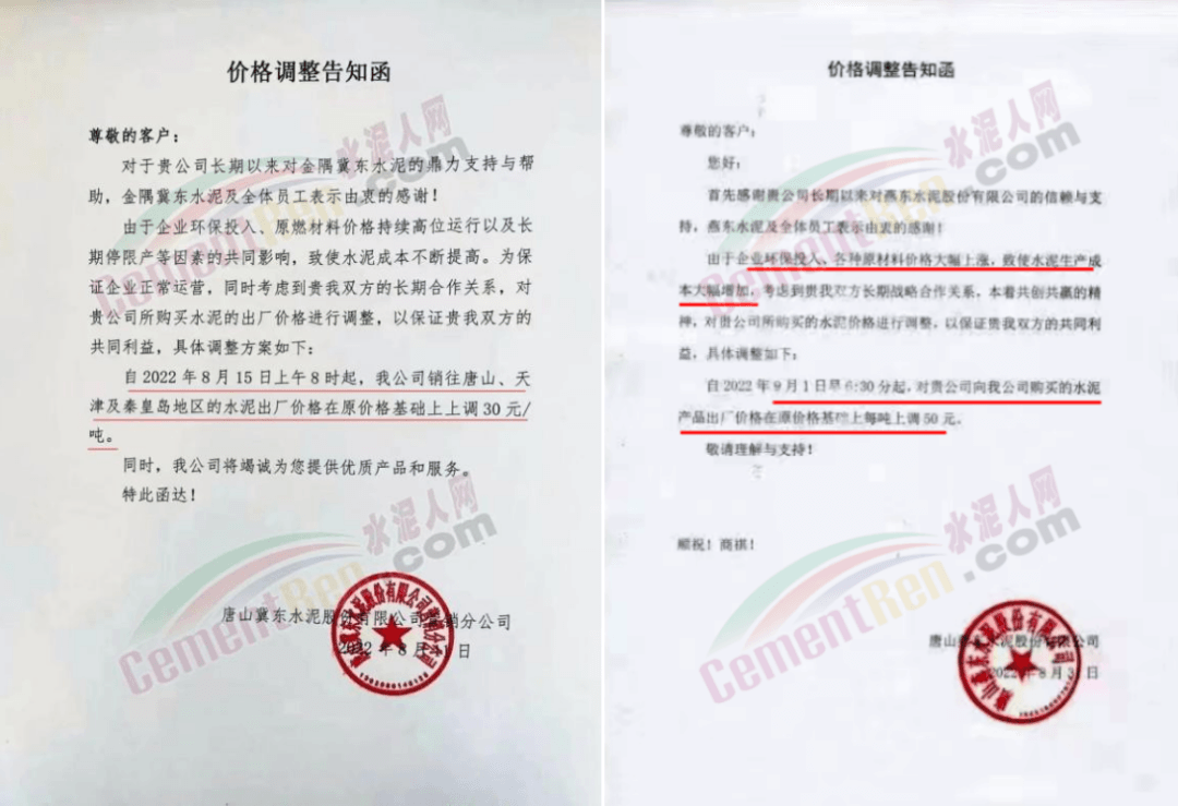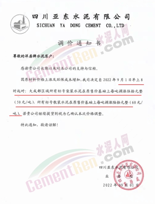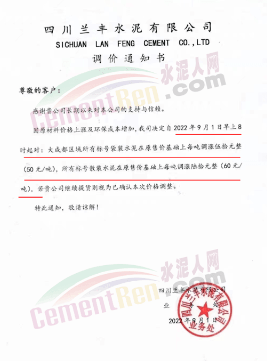 與此同時,四川亞東水泥、四川蘭豐水泥等水泥企業(yè)通知因原材料價格上漲及環(huán)保成本增加,自2022年9月1日早上8時起,大成都區(qū)域所有標號袋裝水泥在原售價基礎上上調(diào)50元/噸,所有標號散裝水泥在原售價基礎上調(diào)60元/噸。