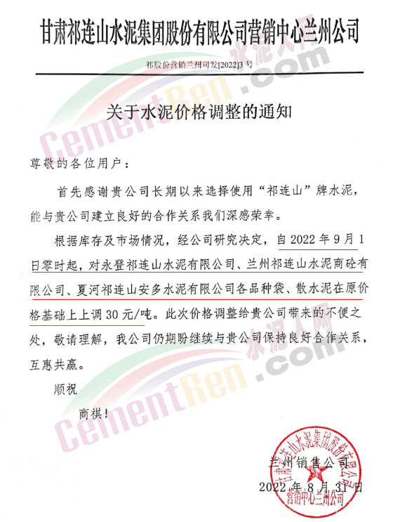 甘肅祁連山水泥集團股份有限公司營銷中心蘭州公司通知,根據(jù)庫存及市場情況,經(jīng)公司研究決定,自2022年9月1日零時起,對永登祁連山水泥有限公司、蘭州祁連山水泥商砼有限公司、夏河祁連山安多水泥有限公司各品種袋、散水泥在原價格基礎上上調(diào)30元/噸。